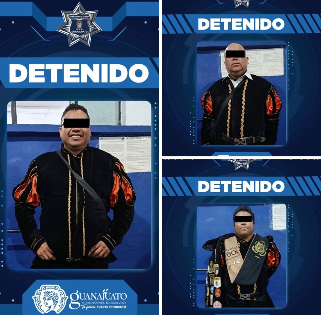 Tres hombres con vestimenta de estudiantina fueron detenidos por elementos de la Policía Municipal tras ser sorprendidos consumiendo bebidas alcohólicas en la vía pública, en la Plaza de los Ángeles, en Guanajuato capital.