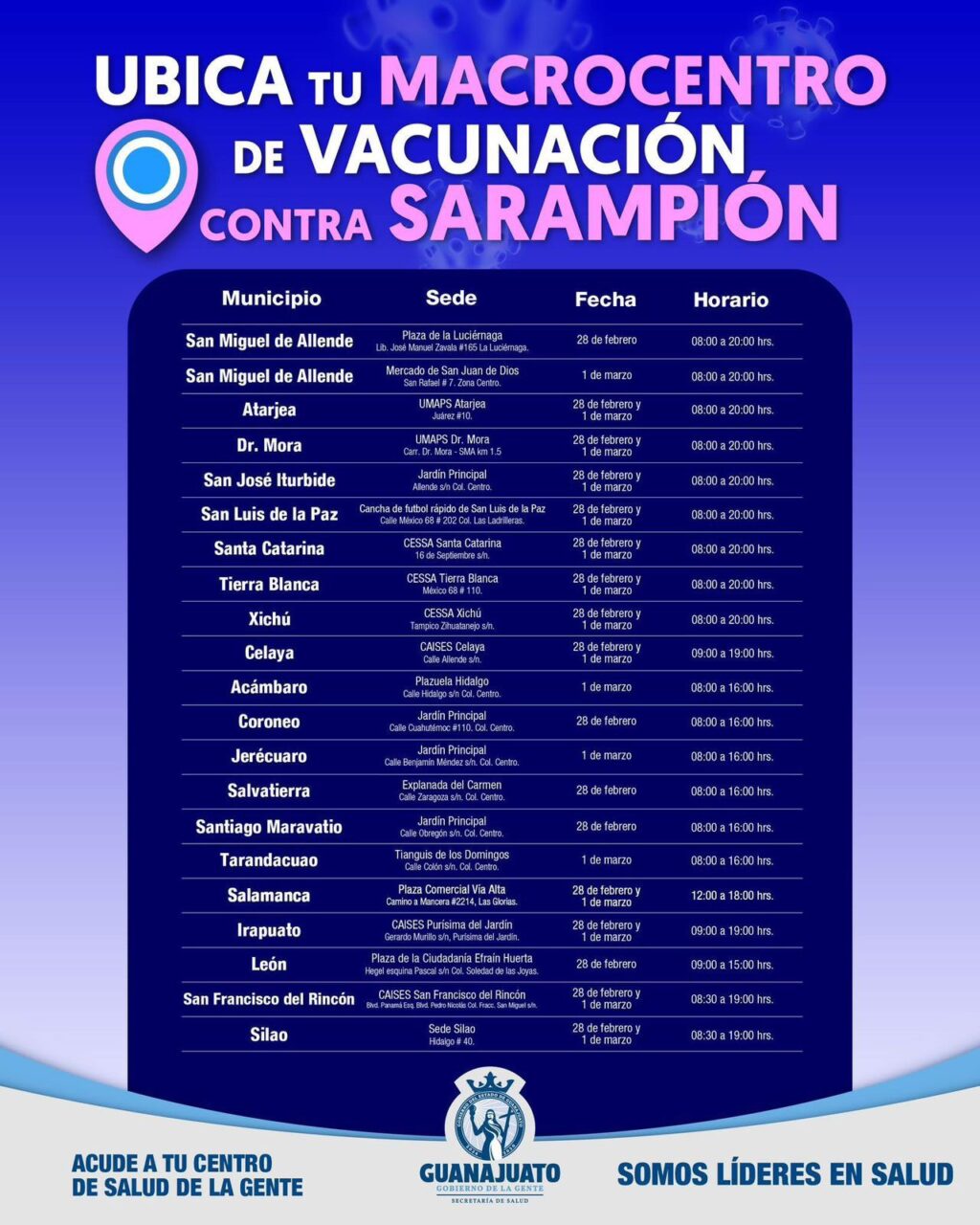 La Secretaría de Salud del Estado de Guanajuato anunció la instalación de 21 Macrocentros de Vacunación contra el sarampión que operarán los días 28 de febrero y 1 de marzo en distintos municipios de la entidad, con el propósito de reforzar la protección de la población y prevenir nuevos casos.