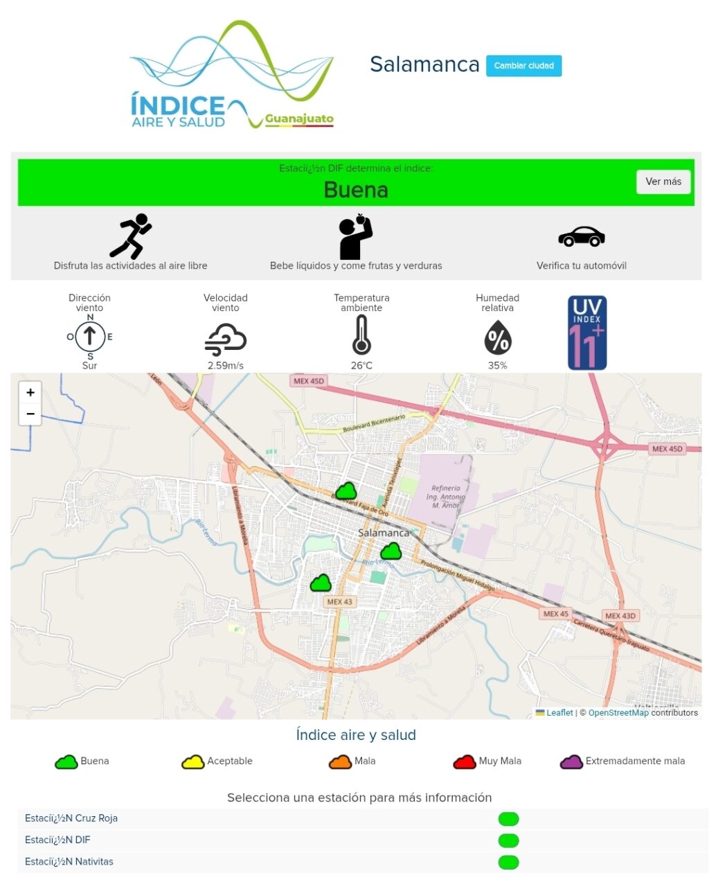 SALAMANCA, GTO. – Tras varias semanas de mantenerse en niveles de «Aceptable», las tres estaciones de monitoreo ambiental en Salamanca registraron este lunes 6 de abril una transición hacia la categoría de Buena, permitiendo a los ciudadanos disfrutar de un entorno visiblemente más despejado.