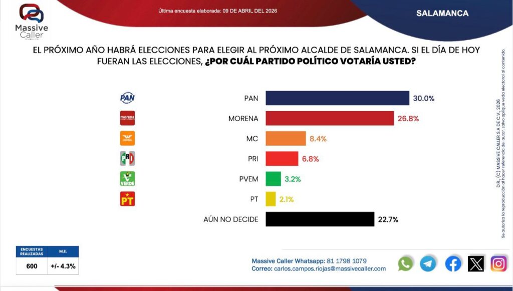 A año y medio de la elección municipal, el Partido Acción Nacional (PAN) perfila una recuperación de la alcaldía de Salamanca, de acuerdo con una encuesta de intención de voto difundida por la firma Massive Caller.