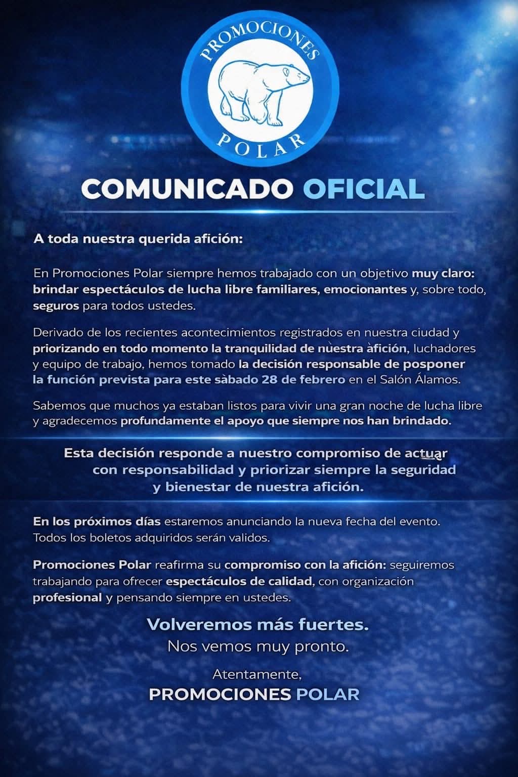 La suspensión también alcanzó a los eventos de alto perfil que ya contaban con boletaje vendido. Tanto la función de box profesional como la cartelera de lucha libre programadas para estos días han sido pospuestas.