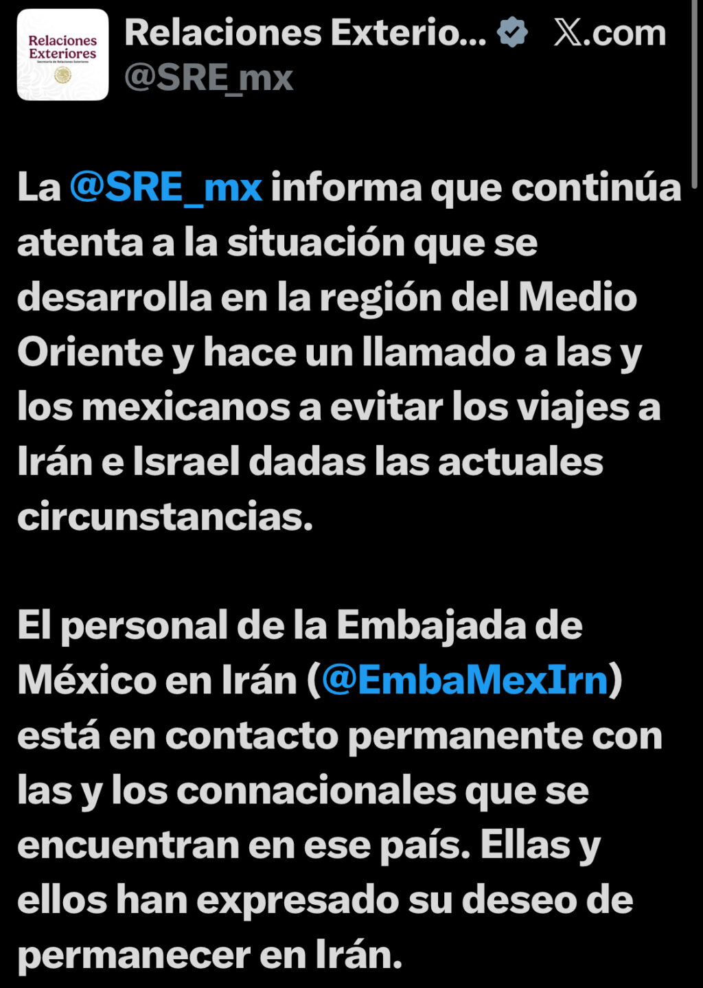 La SRE continúa atenta a la situación que se desarrolla en la Región de Medio Oriente y hace un llamado a las y los mexicanos a evitar los viajes a Iran e Israel dadas las actuales circunstancias”, señaló en un comunicado.