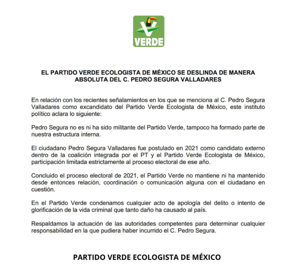 El Partido Verde Ecologista de México (PVEM) se deslindó del ex candidato Pedro Segura Valladares luego de qué fuera puesto en el ojo público por pedir al grupo “ Los alegres del barranco” qué cantará durante un festejo un corrido en honor al abatido líder de un grupo criminal y por amenazar al periodista Carlos Loret de Mola.