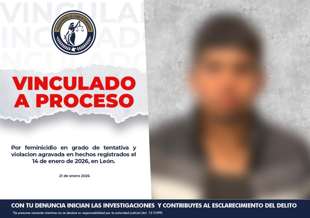 LEÓN, GUANAJUATO. – La Fiscalía General del Estado de Guanajuato (FGEG) obtuvo la vinculación a proceso penal de Edwin Arturo “N”, señalado como el probable responsable de los delitos de feminicidio en grado de tentativa y violación agravada en contra de una adolescente. Los hechos ocurrieron el pasado 14 de enero en la colonia Rizos de la Joya.
