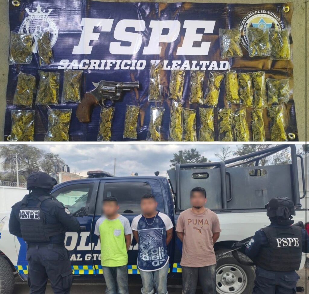 Durante recorridos de vigilancia preventiva en el municipio de Dolores Hidalgo, integrantes de las Fuerzas de Seguridad Pública del Estado de Guanajuato detuvieron a tres personas presuntamente vinculadas con la distribución de droga, tras detectar consumo de sustancias ilícitas en la vía pública.