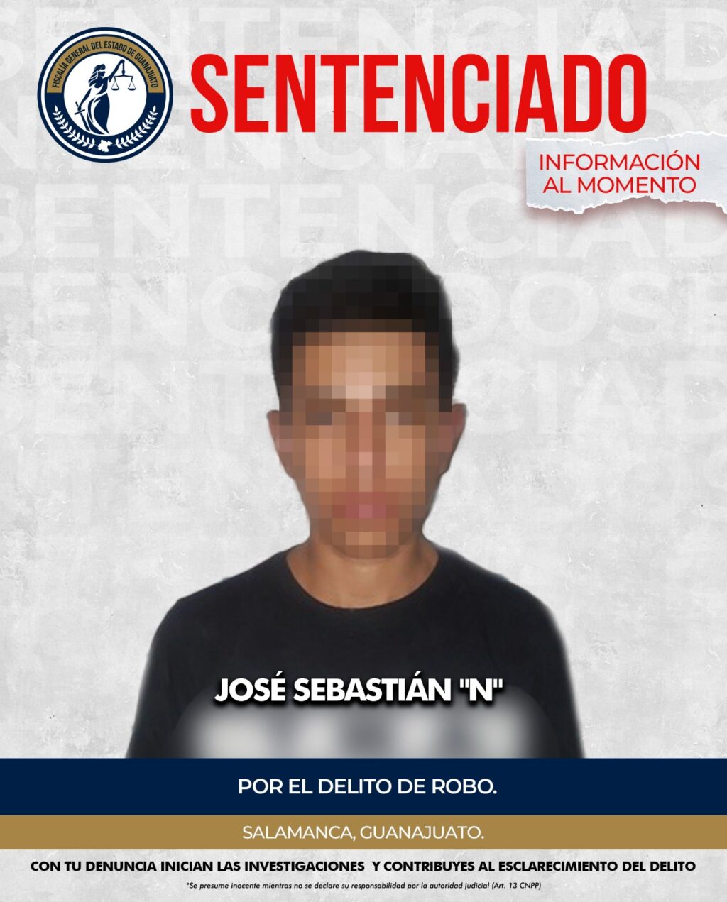 La Fiscalía General del Estado de Guanajuato (FGE) logró que un juez dictara sentencia condenatoria de 11 años y un mes de prisión en contra de José Sebastián “N”, tras acreditarse su responsabilidad penal en el delito de robo calificado en agravio de dos víctimas, en hechos distintos ocurridos en la colonia Bellavista de Salamanca.