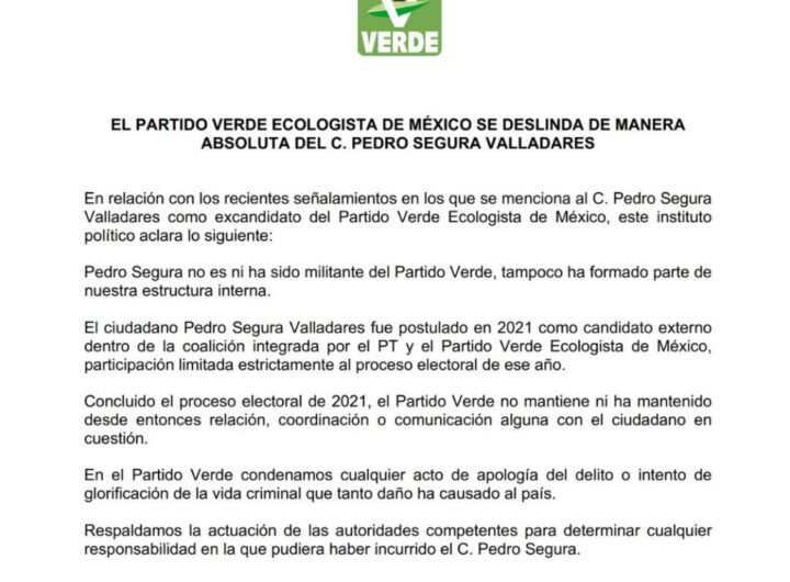 El Partido Verde Ecologista de México (PVEM) se deslindó del ex candidato Pedro Segura Valladares luego de...