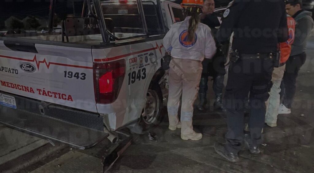 Un choque entre una patrulla de Medicina Táctica y un automóvil rojo dejó tres personas lesionadas este lunes en el cruce del bulevar Solidaridad y avenida Prolongación Calzada de Guadalupe.