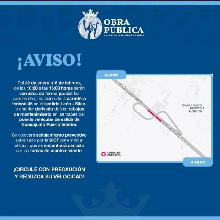 La Secretaría de Obra Pública informó que, del 22 de enero al 6 de febrero, se realizarán cierres parciales en los carriles de la carretera federal 45 en el tramo León-Silao.