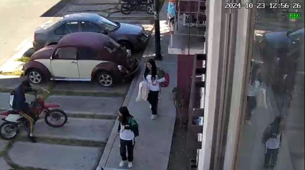 En las imágenes se observa cómo el delincuente, que viajaba en una motocicleta tipo cross, intercepta a las dos jóvenes. Con una pistola en mano, les exige a gritos a una de ellas que entregue su celular de inmediato.