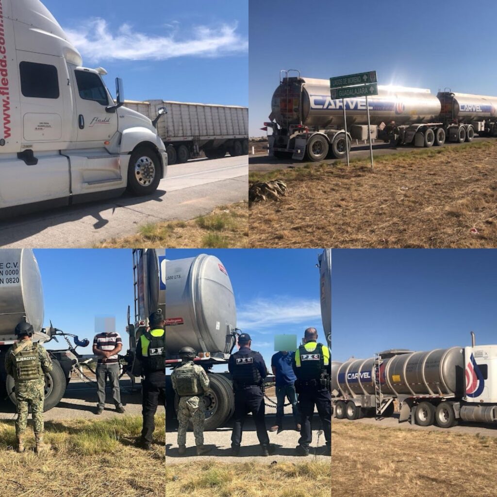 En el tramo San Luis Potosí – Lagos de Moreno, se detectaron tres tractocamiones doble remolque transportando combustible sin documentación legal.