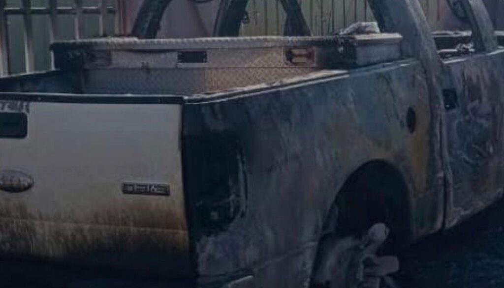 Elementos de la Policía Municipal y de la Guardia Nacional acudieron al sitio, junto con personal de Bomberos Voluntarios, quienes sofocaron el fuego que consumió por completo una camioneta tipo pick up.