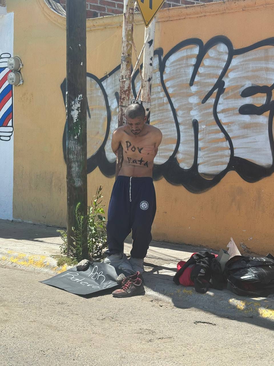 Los vecinos del lugar aprehendieron al sujeto y tras amarrarlo a un poste de metal, le colocaron una cartulina con la leyenda: “Por ratero”, asimismo, le “pintaron” el mismo texto con un plumón en el pecho.
