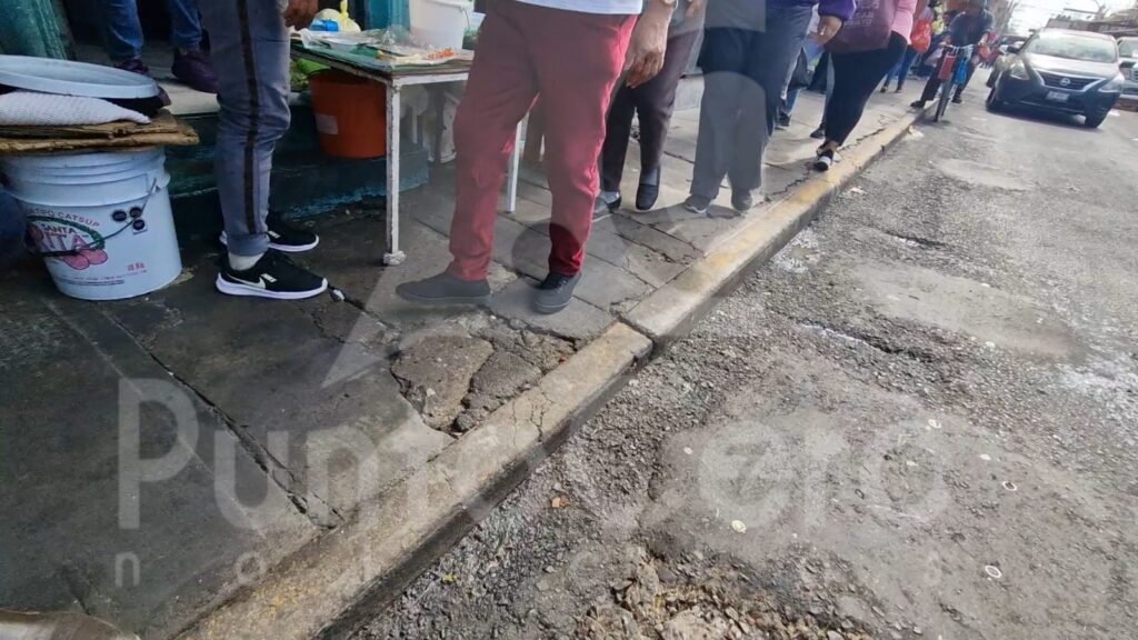 Si bien no es un tema nuevo el mal estado de las banquetas y calles que rodean al mercado, pues en la zona de paradas del transporte público por la Avenida del Trabajo, ahí la calle se volvió a llenar de baches, así como las banquetas se vuelven intransitables.