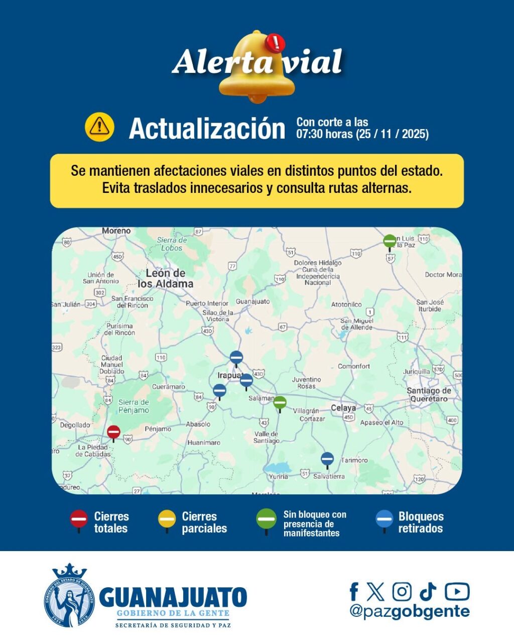 Las autoridades estatales confirmaron que este es el único punto con cierre total en Guanajuato. La Secretaría de Seguridad y Paz informó que se mantiene vigilancia en el área bloqueada para garantizar que la manifestación se desarrolle sin riesgos para los participantes ni para los conductores.
