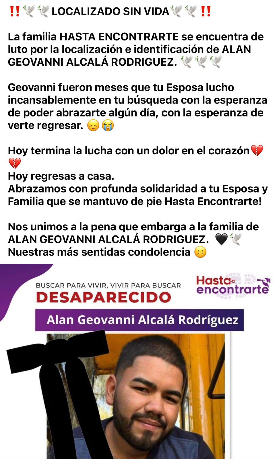 En un mensaje en redes sociales “Hasta Encontrarte” dio a conocer que la familia del colectivo se encuentra de luto por la localización e identificación de Geovanni Alcalá Rodríguez.