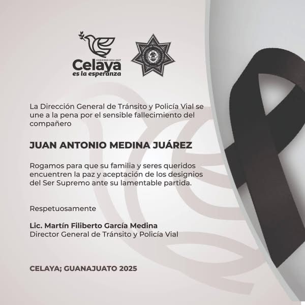 La Secretaría de Seguridad Ciudadana de Celaya confirmó el fallecimiento del tránsito municipal Juan Antonio Medina Juárez, quien permanecía desaparecido desde el pasado 26 de agosto, tras haber sido privado de la libertad en la colonia Hacienda.