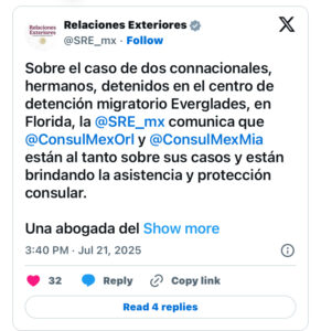 «Ante esta situación, exigimos el acceso inmediato de su abogada y, por las condiciones observadas, sugeriré a las autoridades mexicanas considerar la emisión de una alerta de viaje para turistas mexicanos a Orlando». Aseveró el cónsul.