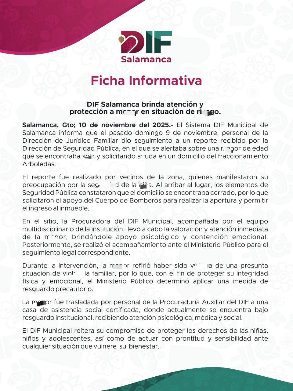 Salamanca, Gto.- El Sistema DIF Municipal de Salamanca informó que, en colaboración con el Cuerpo de Bomberos y Seguridad Pública, se brindó atención y protección a una menor de edad que se encontraba en situación de riesgo en un domicilio del fraccionamiento Arboledas.