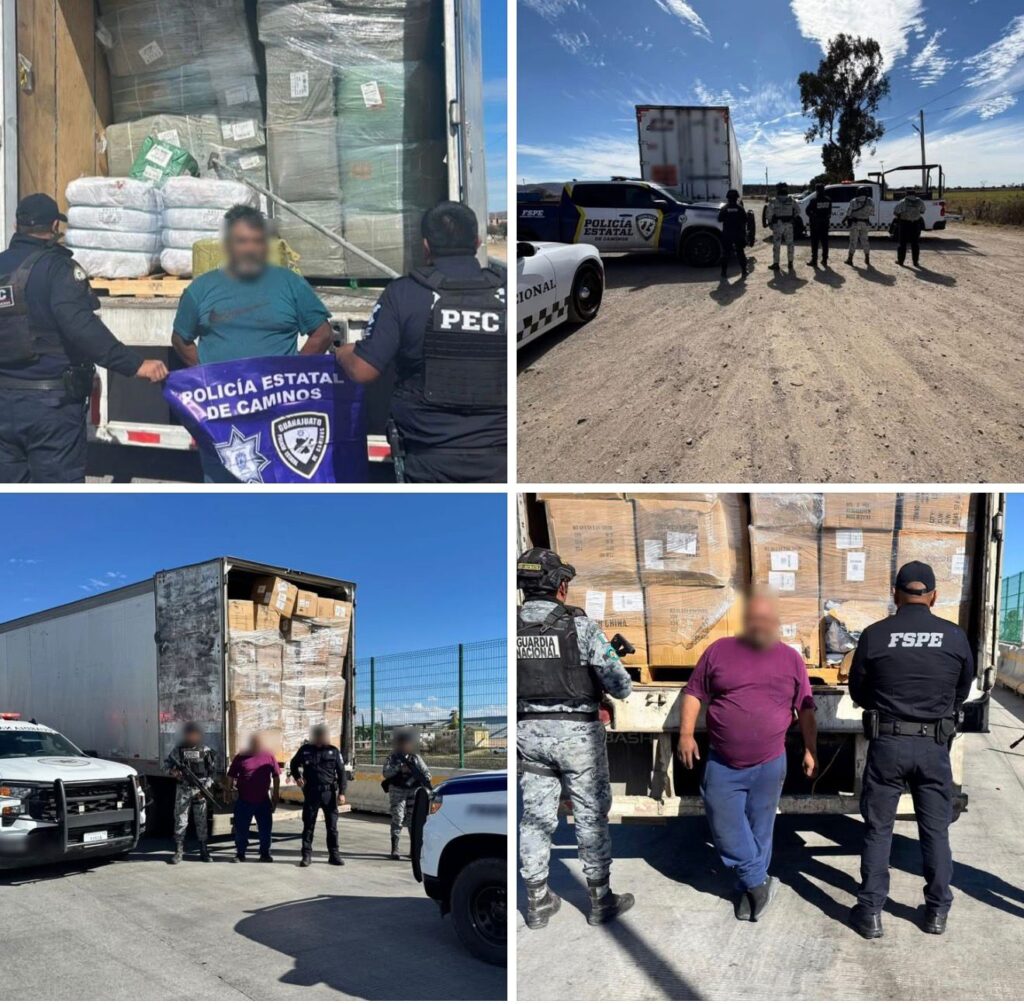 Autoridades estatales y federales aseguraron dos tractocamiones que transportaban mercancía extranjera de presunta procedencia ilegal, con un valor comercial estimado en 9 millones de pesos, como parte de operativos de inspección en carreteras de Guanajuato.