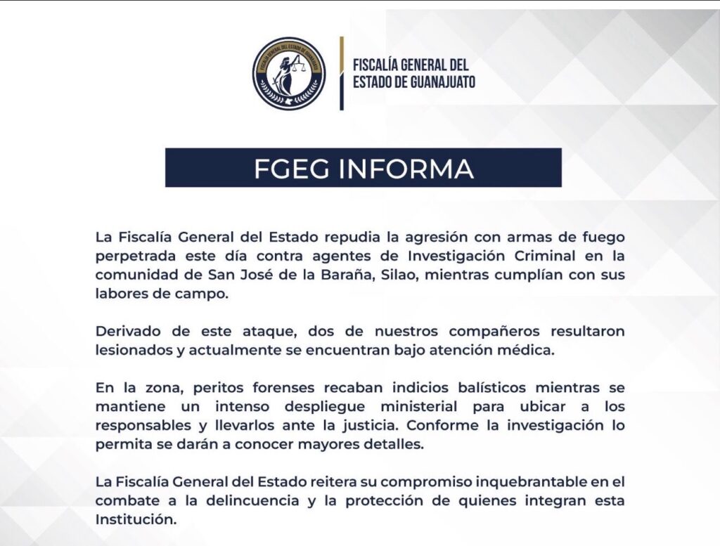 La Fiscalía General del Estado de Guanajuato confirmó que dos agentes de Investigación Criminal resultaron lesionados tras la agresión con armas de fuego registrada en la comunidad de San José de la Baraña, en el municipio de Silao.