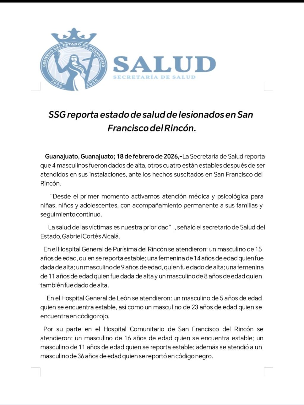GUANAJUATO, GTO. – La Secretaría de Salud del Estado (SSG) emitió un reporte actualizado sobre el estado de salud de las personas lesionadas durante los acontecimientos violentos registrados en el municipio de San Francisco del Rincón. Hasta el momento, el saldo médico confirma que cuatro personas han sido dadas de alta, mientras que el resto permanece bajo observación especializada.