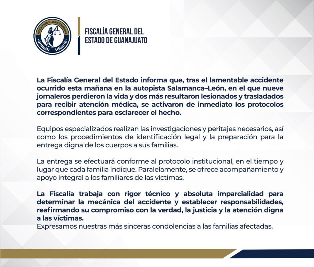 Salamanca, Gto. — La Fiscalía General del Estado de Guanajuato (FGE) confirmó, a través de una ficha informativa, que el accidente ocurrido esta mañana en la autopista Salamanca-León dejó un saldo de nueve personas fallecidas y dos lesionados, quienes fueron trasladados a recibir atención médica.