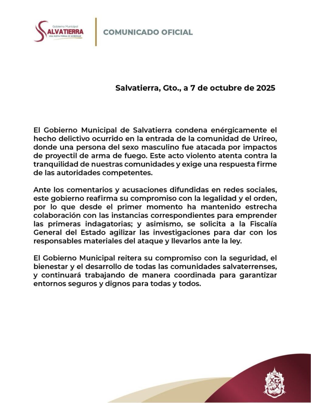 El gobierno municipal de Salvatierra condenó enérgicamente el ataque perpetrado contra un ciudadano que realizaba una transmisión en vivo para reportar baches y vialidades en mal estado en la comunidad de Urireo.