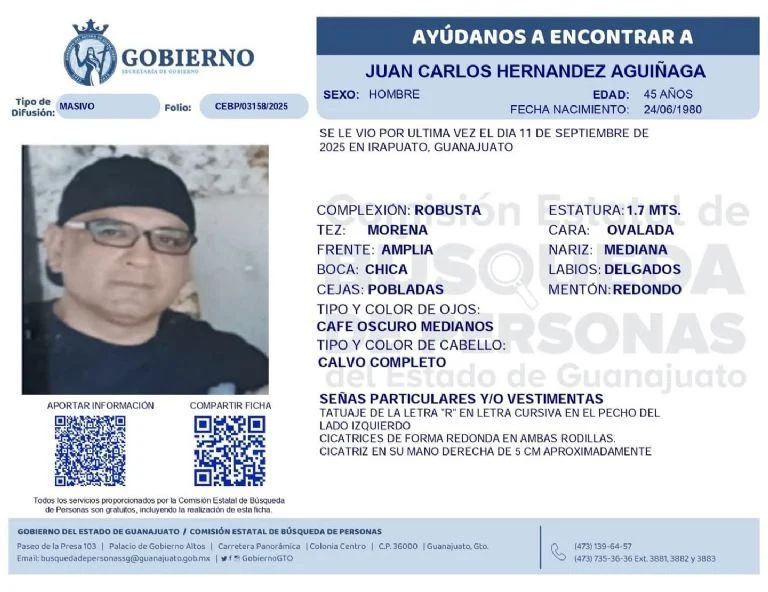 A su desaparición, la Secretaría de Seguridad y Paz del Estado de Guanajuato emitió su ficha de búsqueda, mientras la familia mantenía la esperanza de que fuera localizado con vida.