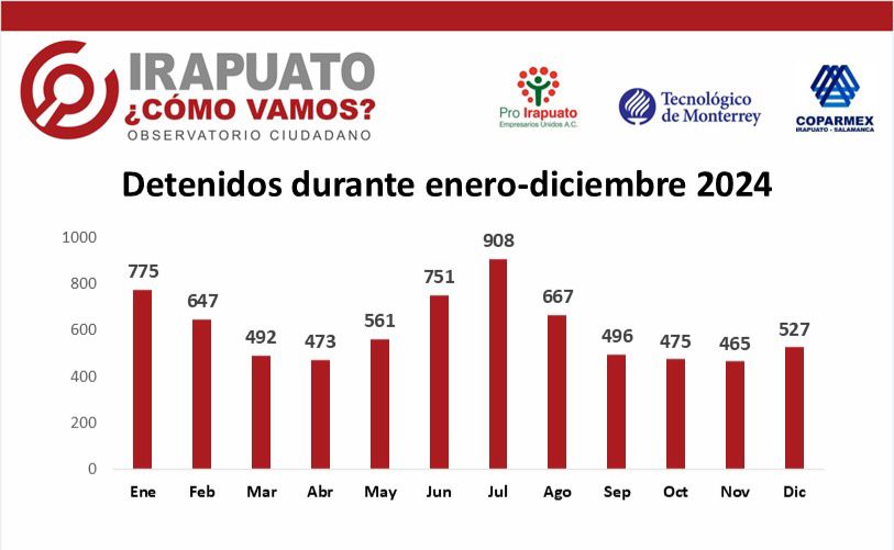 Durante el periodo de enero a diciembre del 2024, el observatorio ciudadano “Irapuato Cómo Vamos” registró un total de 7 mil 237 personas detenidas en el municipio, de las cuales 6 mil 565 corresponden a faltas administrativas y 672 a presuntos delitos.