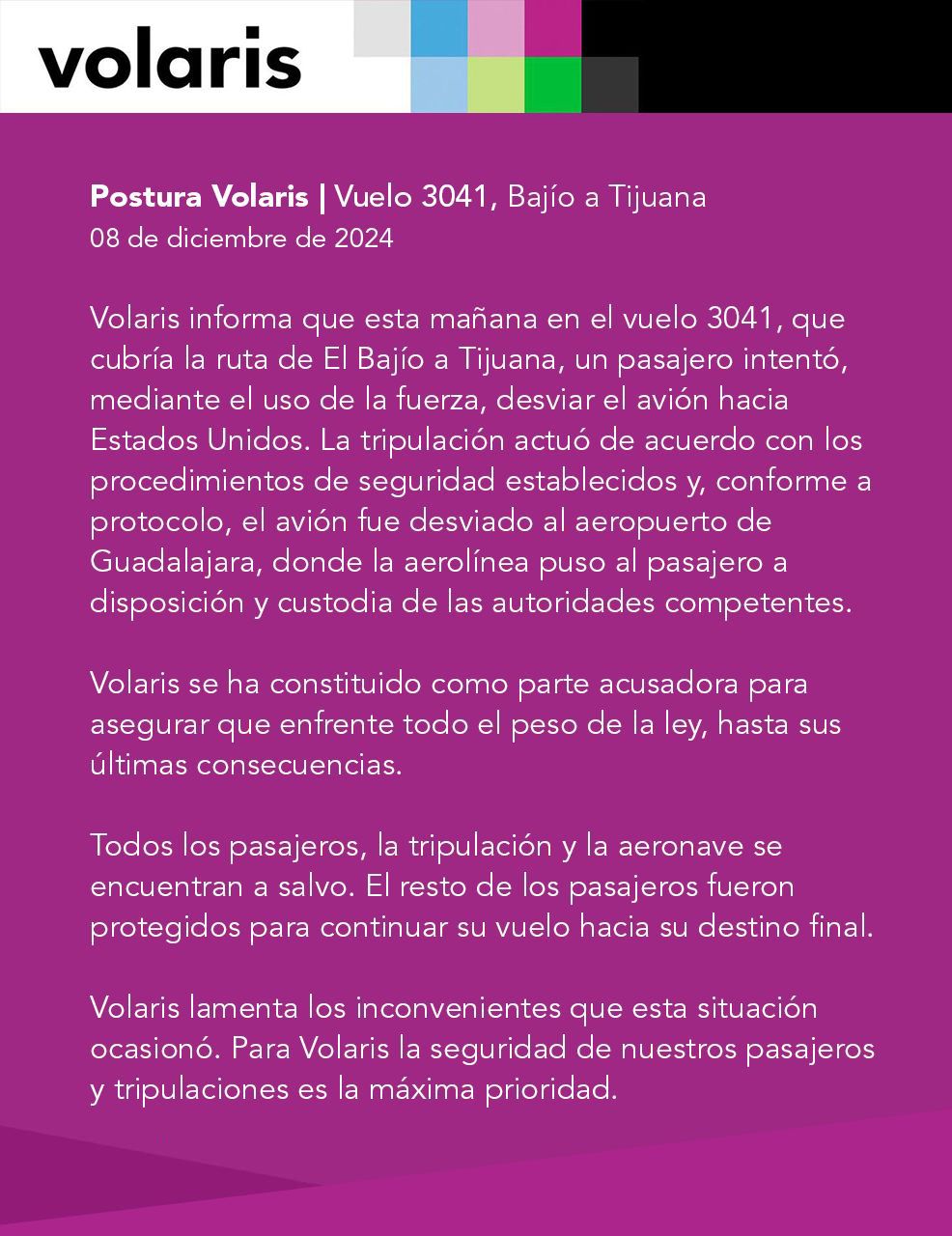 Ante la situación, la tripulación siguió los protocolos de seguridad, desviando el avión al aeropuerto de Guadalajara, donde el pasajero fue puesto a disposición de las autoridades competentes.