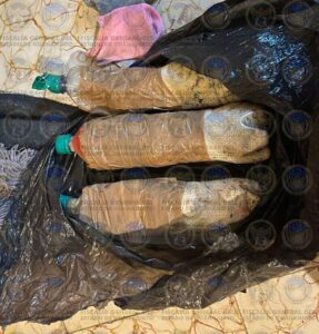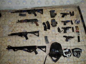 En el lugar se aseguraron un vehículo robado, una motocicleta alterada, inhibidores de señal, narcóticos, cargadores, cartuchos, explosivos improvisados y armas de uso exclusivo militar.