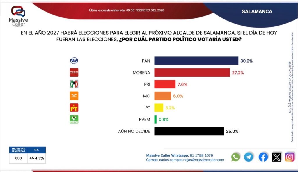 Si hoy se celebraran las elecciones en el municipio de Salamanca, el Partido Acción Nacional (PAN) resultaría ganador, de acuerdo con una encuesta publicada por la empresa Massive Caller.