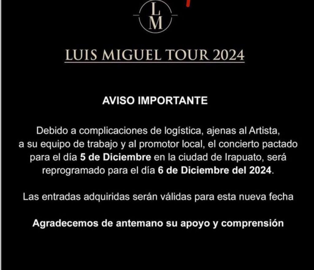 Luis Miguel ha reprogramado el concierto que estaba previsto para el 5 de diciembre en Irapuato, trasladándolo al día siguiente, 6 de diciembre de 2024.