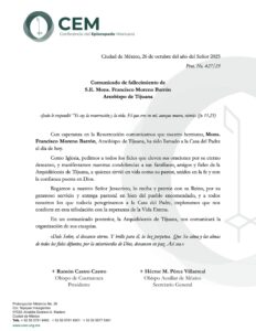 La Conferencia del Episcopado Mexicano (CEM) lamentó el fallecimiento de su hermano y extendió sus condolencias a la Arquidiócesis de Tijuana.