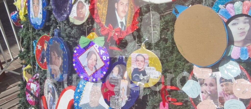 • Madres buscadoras, ponen 70 esferas con las fotos de sus desaparecidos en el árbol navideño de la plazoleta Miguel Hidalgo.