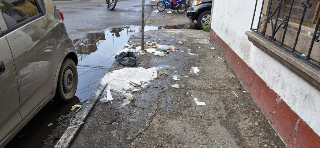 «PASAN LOS DE LA BASURA, PERO NO SE LLEVAN TODO, SOLO AVIENTAN LAS BOLSAS, SI SE LES CAE ALGO O SE LES OLVIDA ALGO, NO LO RECOGEN, AHÍ LO DEJAN. POR ESO SE TAPA LA ALCANTARILLA, POR ESO SE HACEN MÁS CHARCOS, NO SE DIGA CUANDO ES TIANGUIS, POR LA NOCHE ES UN ATASCADERO LA ZONA.»