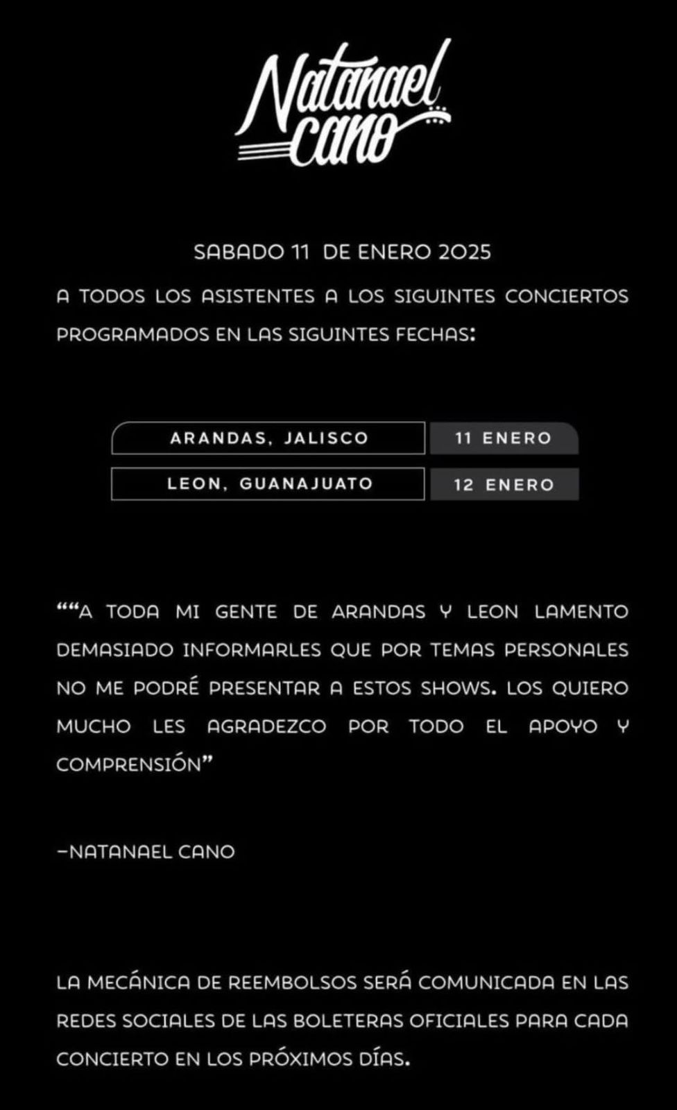“A toda mi gente de Arandas y León lamento demasiado informarles que por temas personales no me podré presentar a estos shows. Los quiero mucho y les agradezco por todo el apoyo y comprensión”, escribió Cano en el mensaje.