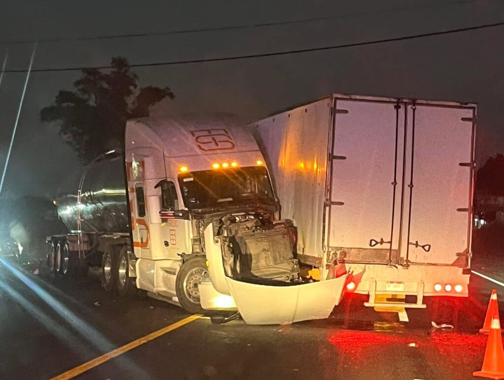 Las unidades de carga quedaron atravesadas en los carriles de alta y baja velocidad, y por fortuna, todo parece que quedó en daños materiales.