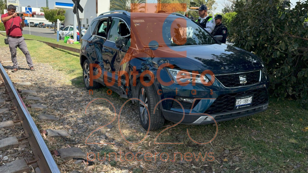 A pesar de la magnitud del impacto, el conductor de la camioneta SEAT azul que fue embestida por el tren en Irapuato resultó ileso.