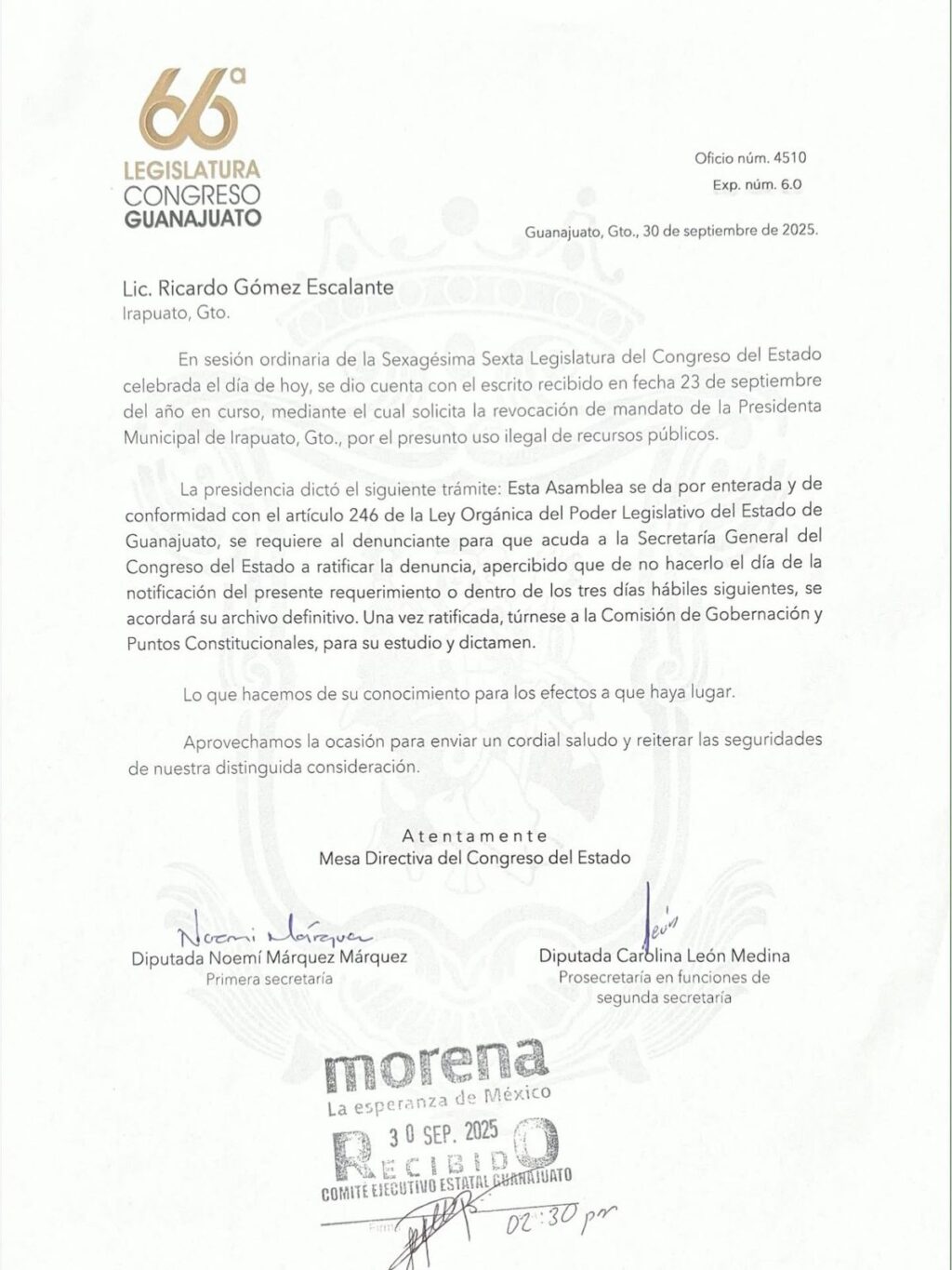 Ricardo Gómez Escalante, secretario de Organización del Comité Estatal de Morena, anunció que llevó al Congreso del Estado una solicitud de revocación de mandato en contra de la presidenta municipal de Irapuato, Lorena Alfaro García, por temas de corrupción y falta de transparencia.