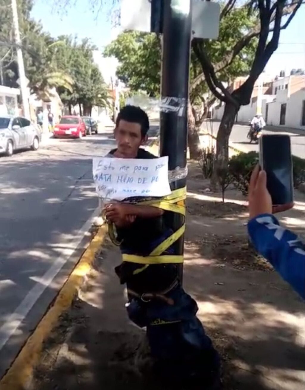 El sujeto, cuya identidad aún no ha sido confirmada, fue atado a un poste metálico con cintas y, como muestra de castigo, los habitantes colocaron sobre él una cartulina con la leyenda: “ESTO ME PASÓ POR RATA”.
