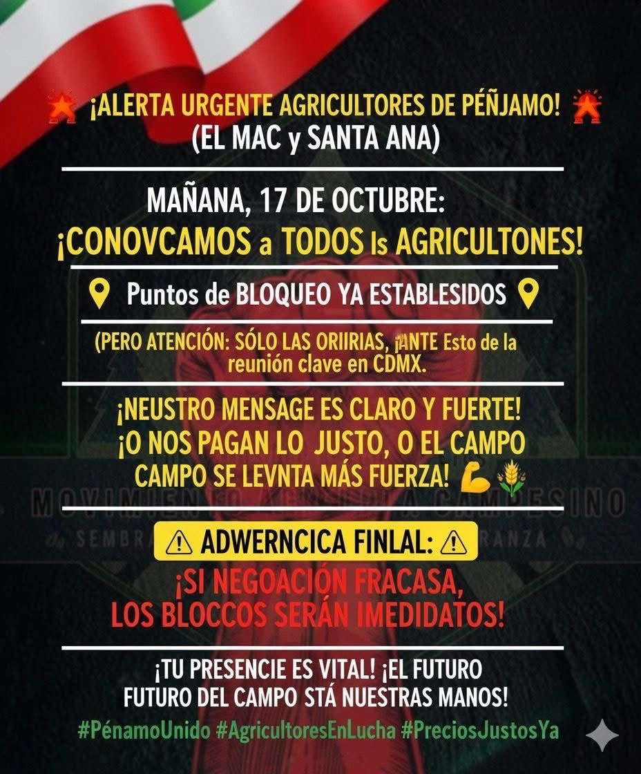 A partir de las 08:30 horas, los agricultores se apostarán con tractores y unidades agrícolas en puntos como Santa Ana Pacueco, Pénjamo, Cuerámaro, Abasolo, Pueblo Nuevo e Irapuato, en lo que describieron como una jornada de vigilancia y solidaridad con sus representantes.