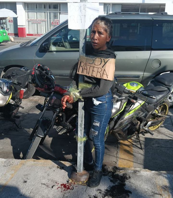 En el sitio, la mujer fue amarrada a un poste y rapada, además de que le colocaron un cartón con la leyenda “Soy ratera”, lo que llamó la atención de decenas de personas que presenciaron los hechos.