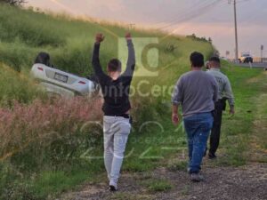 Al llegar los cuerpos de auxilio, se encontró un automóvil marca Chevrolet tipo Beat color gris volcado a un costado de un campo de la cinta asfáltica, así como a un hombre quien dijo ser el conductor, mismo que tras ser valorado por los socorristas se informó que solo presentó golpes menores, por lo que no fue necesario trasladarlo a un nosocomio.