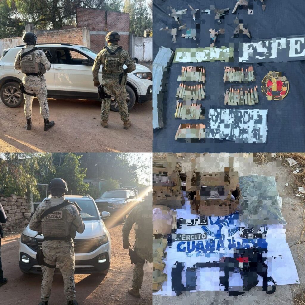 Tras la persecución, los individuos huyeron a pie; el vehículo, un Volkswagen T-Cross con reporte de robo, fue asegurado junto con: una carabina calibre .223 con cargador abastecido, cartuchos percutidos, cargador adicional, chalecos, casco balístico, uniformes tácticos y equipo táctico diverso.