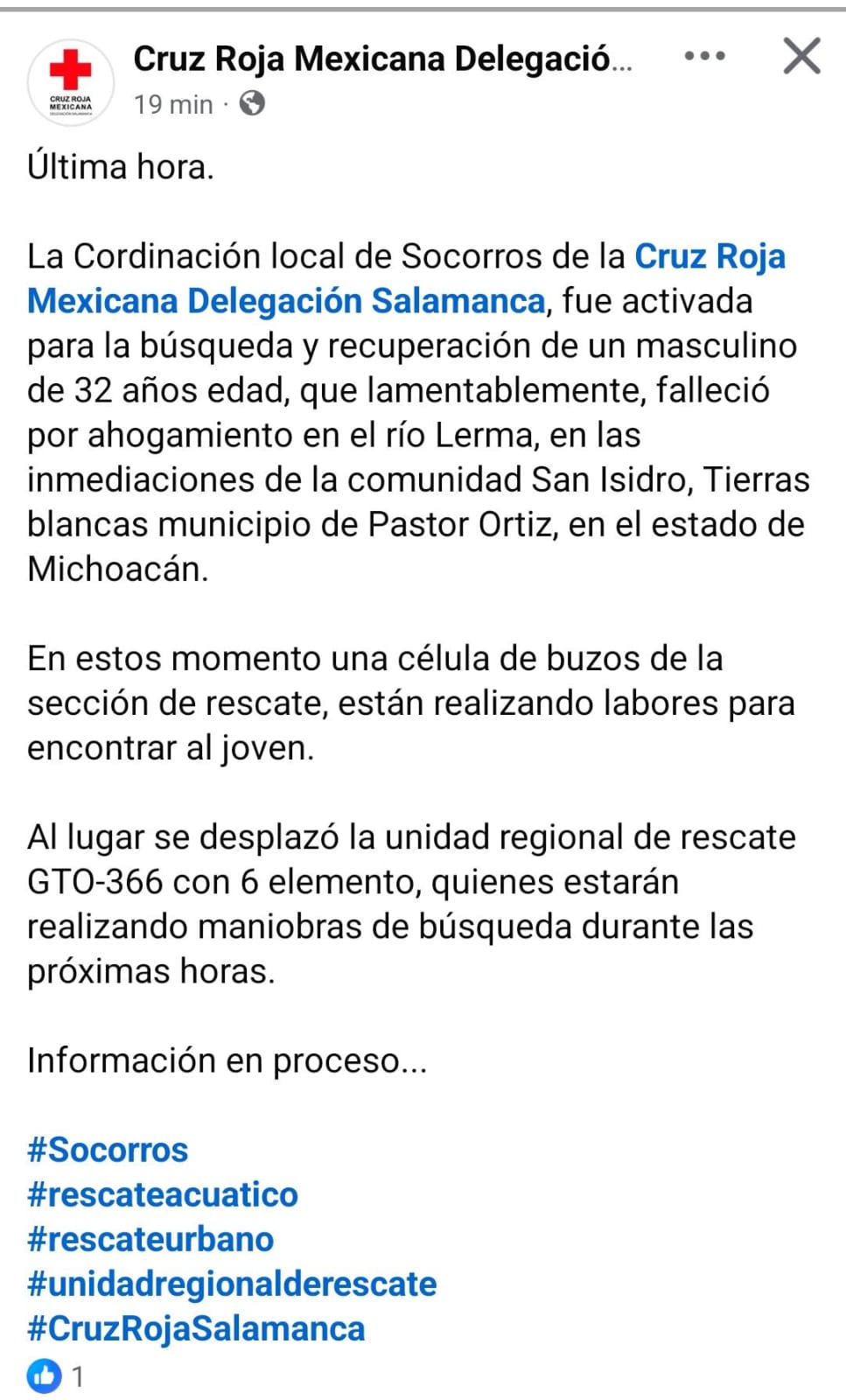 La Coordinación Local de Socorros de la Cruz Roja Mexicana Delegación Salamanca fue activada para participar en la búsqueda y recuperación del cuerpo de un hombre de 32 años de edad, quien falleció por ahogamiento en el río Lerma, en territorio del estado de Michoacán.