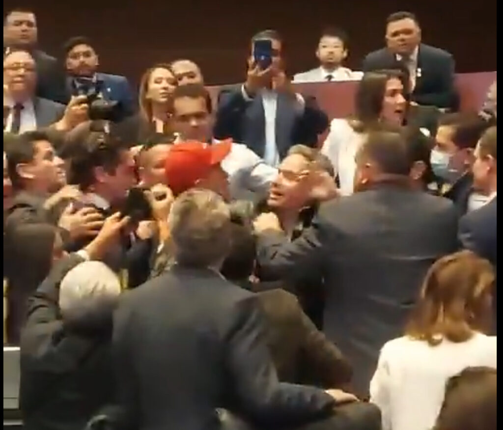 Se observó cómo el morenista Luis Fernando Salazar empuja y manotea al senador Vargas del Villar, mientras el coordinador del PVEM, Manuel Velasco Coello, e interpone para separarlos, en tanto que senadoras panistas gritaban “¡Ya, váyanse a su lugar, váyanse!”.