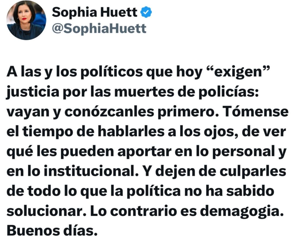“Los políticos que hoy ‘exigen’ justicia por las muertes de policías: vayan y conózcanles primero. Tómense el tiempo de hablarles a los ojos, de ver qué les pueden aportar en lo personal y en lo institucional. Y dejen de culparles de todo lo que la política no ha sabido solucionar. Lo contrario es demagogia. Buenos días”, escribió en sus redes sociales.