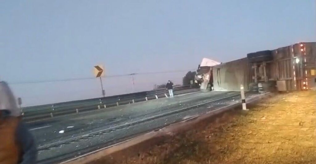 La volcadura de un tráiler mantiene detenido el tránsito vehicular en la autopista Querétaro-Celaya, a la altura del basurero municipal de Apaseo el Grande, durante la mañana de este sábado.